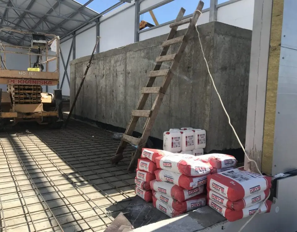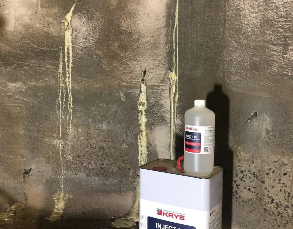 - Герметизація швів та отворів: Усі стики між термоблоками, а також технологічні отвори та дефекти заливки були ретельно заповнені та закарбовані безусадковим ремонтним матеріалом KRYS RM FAST. Це дозволило створити жорстку та рівну основу, ліквідувавши шляхи прямого проникнення води.