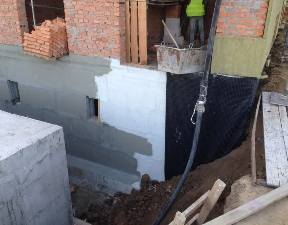 - Створення еластичної мембрани: На підготовлену поверхню стін нанесено двокомпонентну гідроізоляцію KRYS FLEX у 2 шари. Завдяки своїй еластичності, цей матеріал надійно перекриває мікротріщини на стиках блоків і витримує можливі температурні деформації конструкції без порушення герметичності.