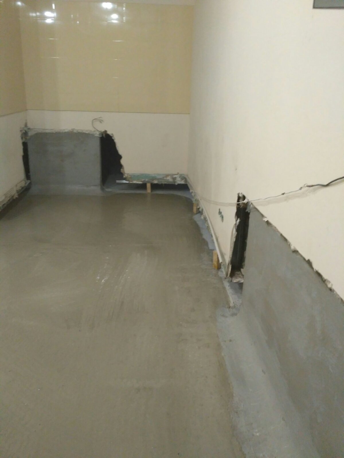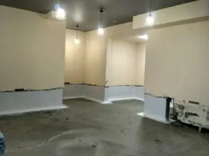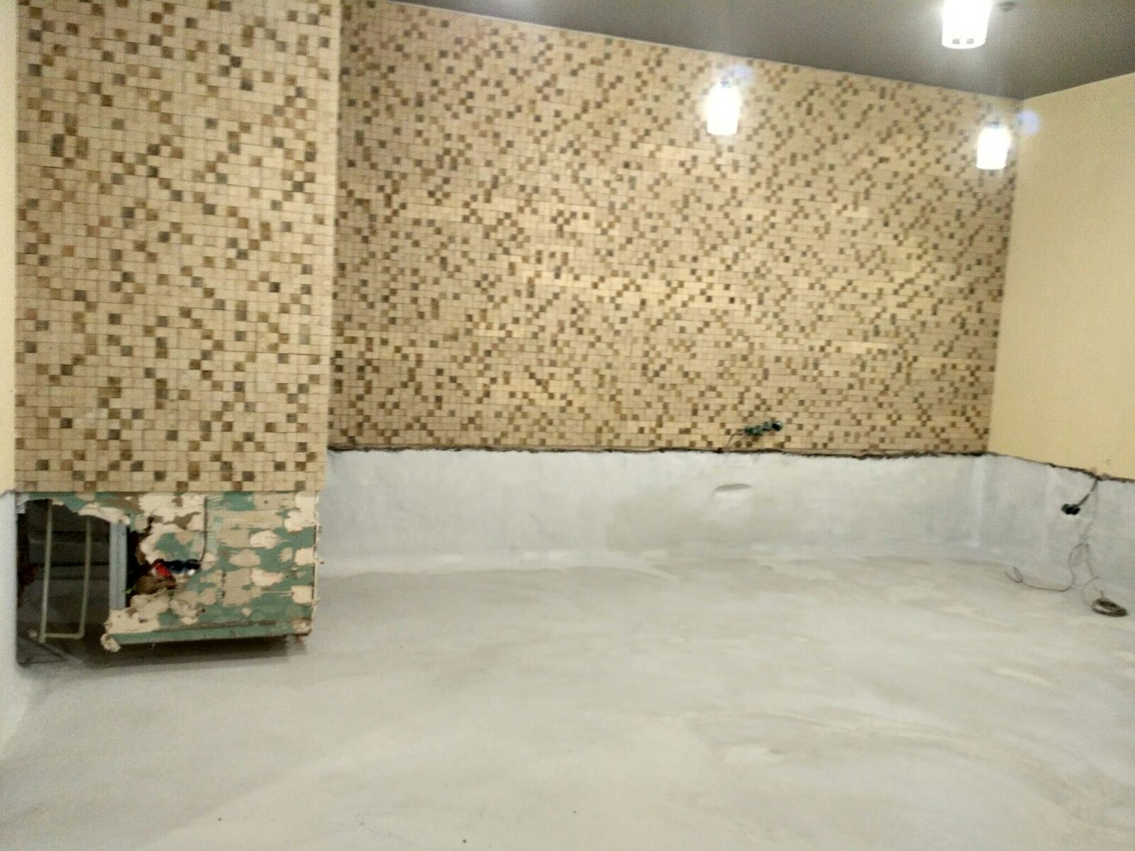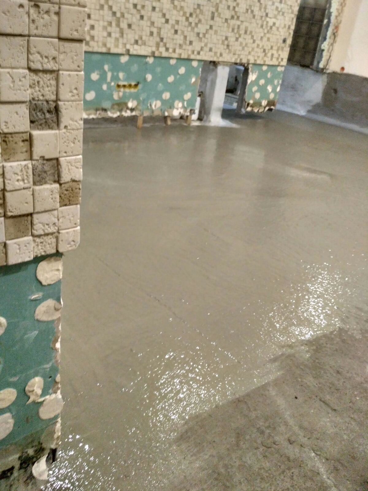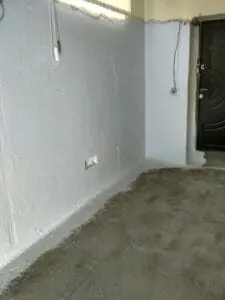 - Подготовка и демонтаж: С поверхностей стен и пола полностью удалена декоративная отделка. Выполнена мойка аппаратом высокого давления для устранения хрупких частиц и открытия пор бетонного основания.