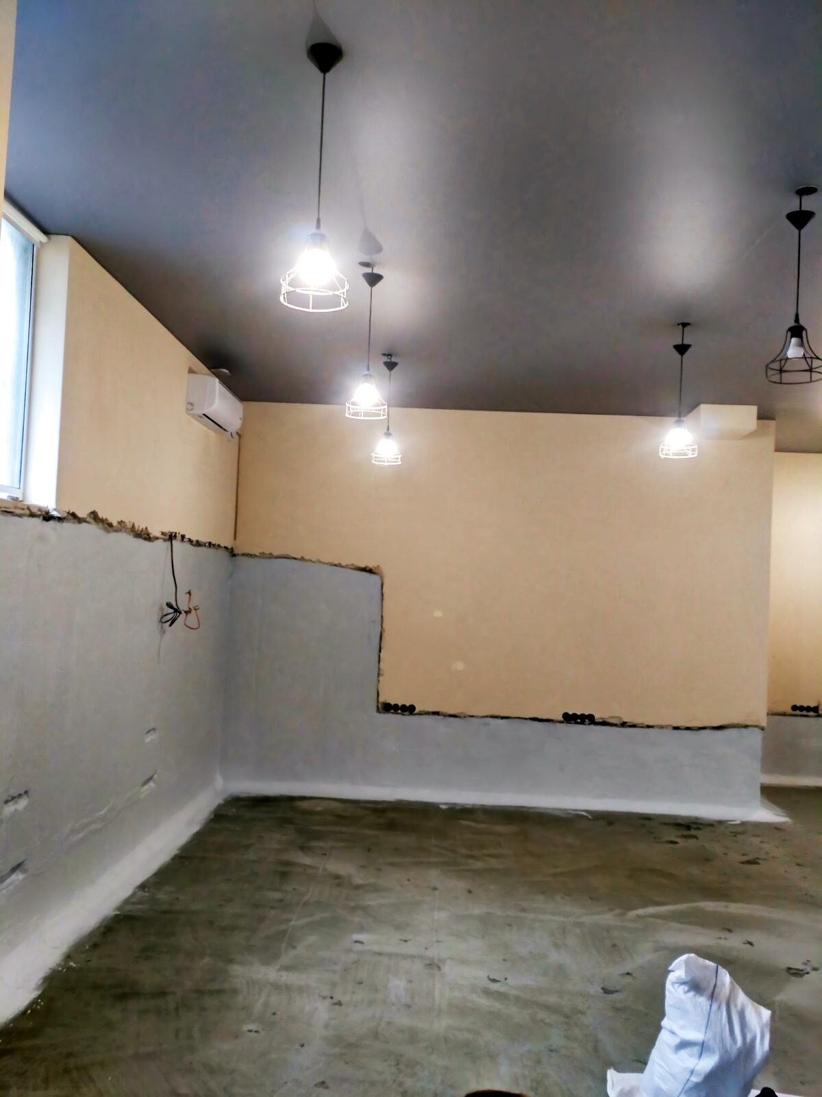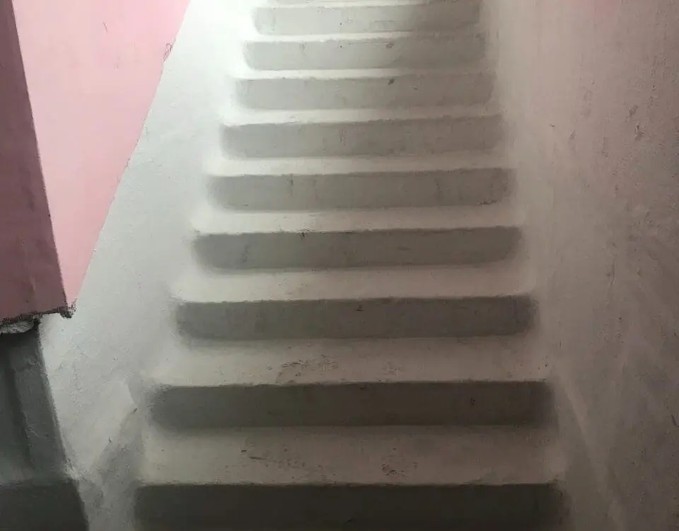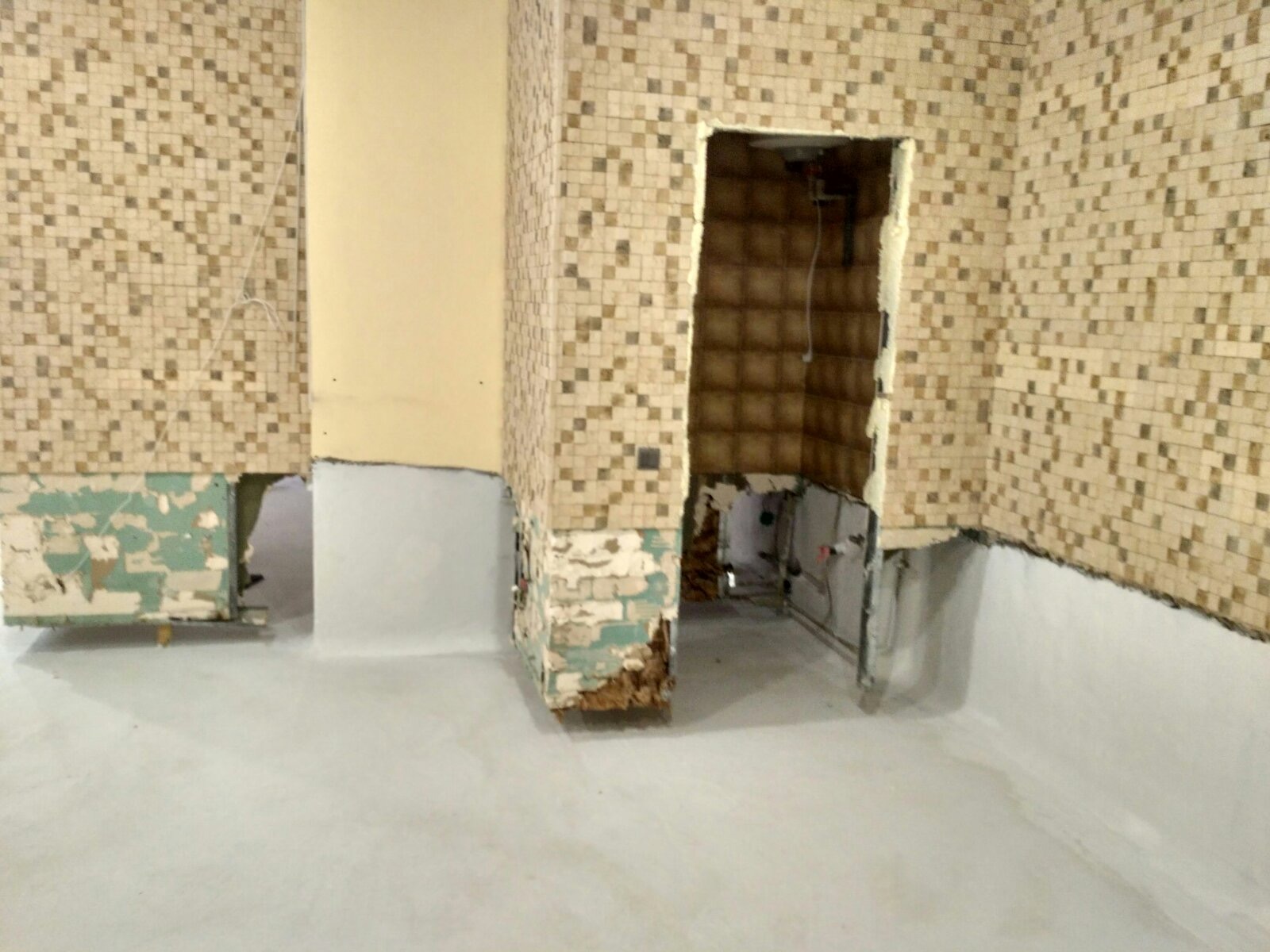 - Подготовка и демонтаж: С поверхностей стен и пола полностью удалена декоративная отделка. Выполнена мойка аппаратом высокого давления для устранения хрупких частиц и открытия пор бетонного основания.