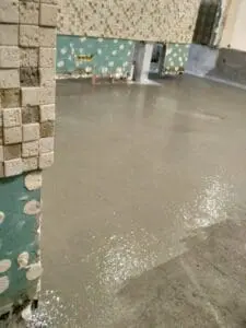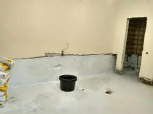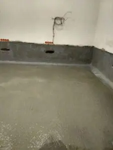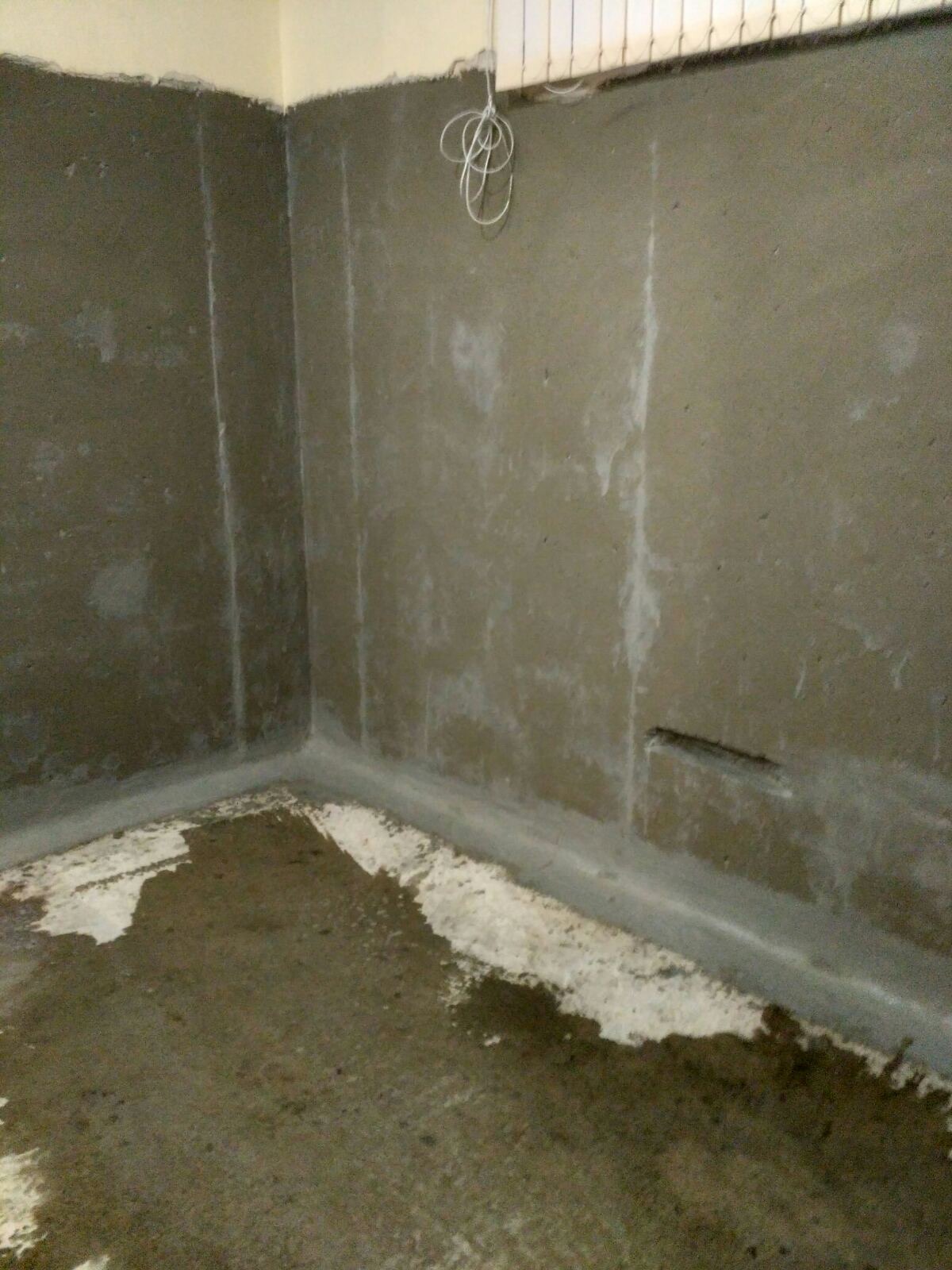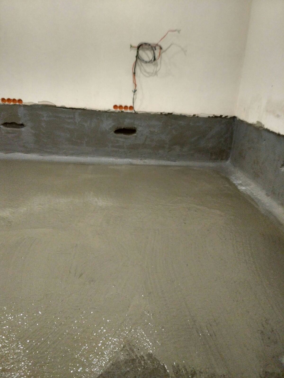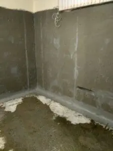 - Создание защитного слоя: На всю подготовленную поверхность стен (на заданную высоту) и пола нанесено два слоя двухкомпонентной гибкой гидроизоляции KRYS FLEX.