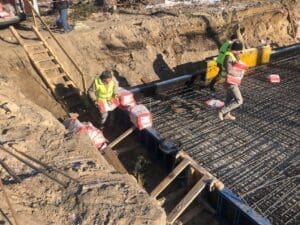 - Бетонирование и активация: Выполнен прием и укладка бетонной смеси. Влага из свежего бетона растворила активные компоненты KRYS PREMIUM, которые начали мигрировать вверх в тело плиты, вызывая рост нерастворимых кристаллов в капиллярах бетона.