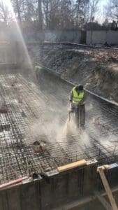 - Внесение материала: На подготовленное основание (бетонную подготовку) перед укладкой основного бетона равномерно рассыпан сухой порошок KRYS PREMIUM. Расход составил 2,1-2,3 кг/м², что обеспечивает необходимую концентрацию активных веществ.