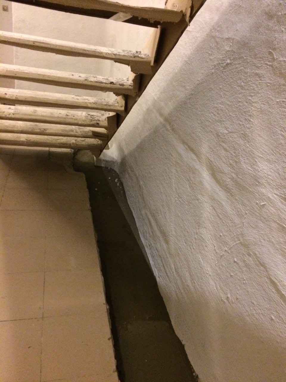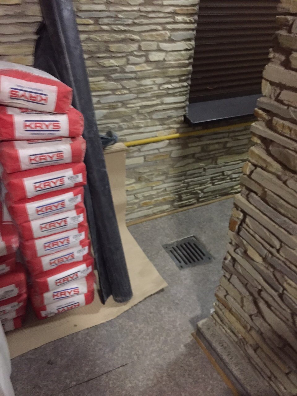 - Укрепление стен: Из-за низкой прочности блоков выполнено сплошное оштукатуривание стен высокопрочным ремонтным составом KRYS RM FAST. Это позволило создать новую, прочную и стабильную основу. Этим же материалом заделаны все швы и примыкания.