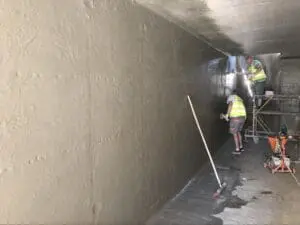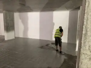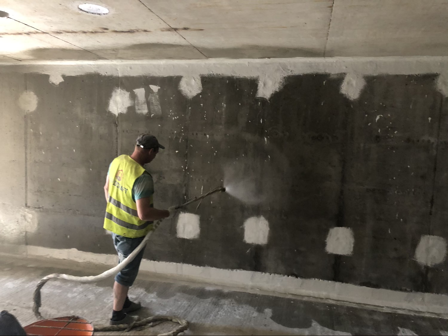 - Гидроструйная подготовка: Стены очищены водой под давлением 300 атм для удаления цементной пленки и открытия капилляров бетона.