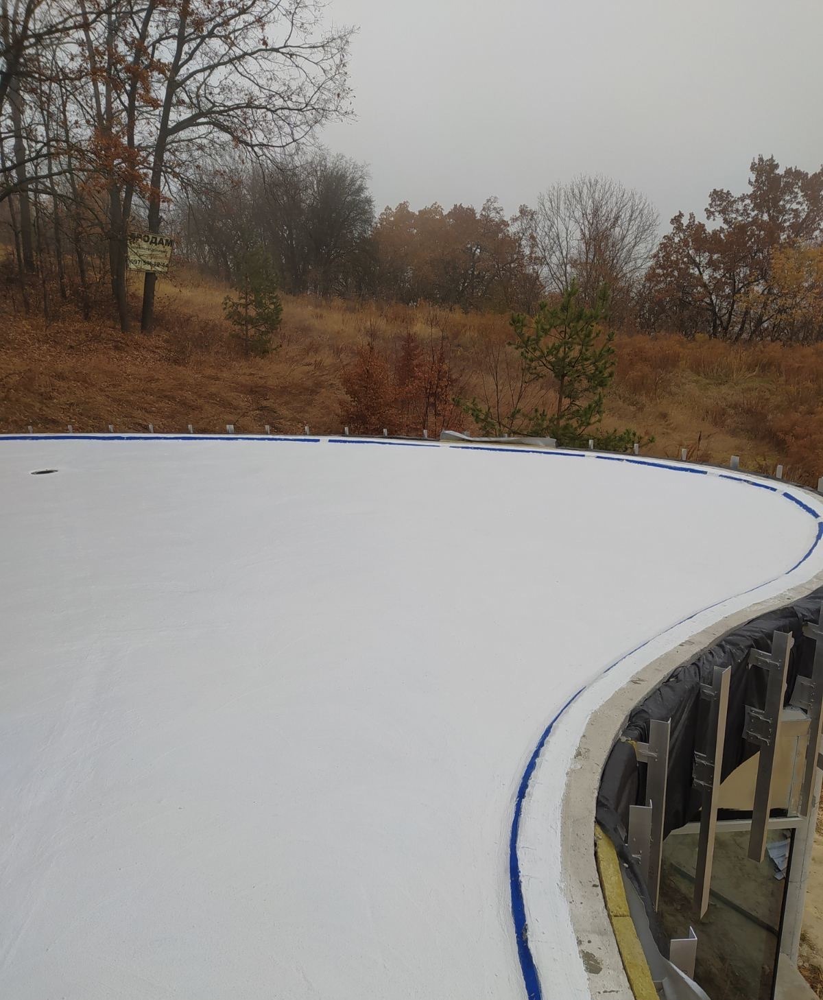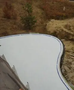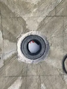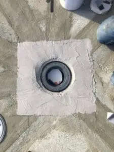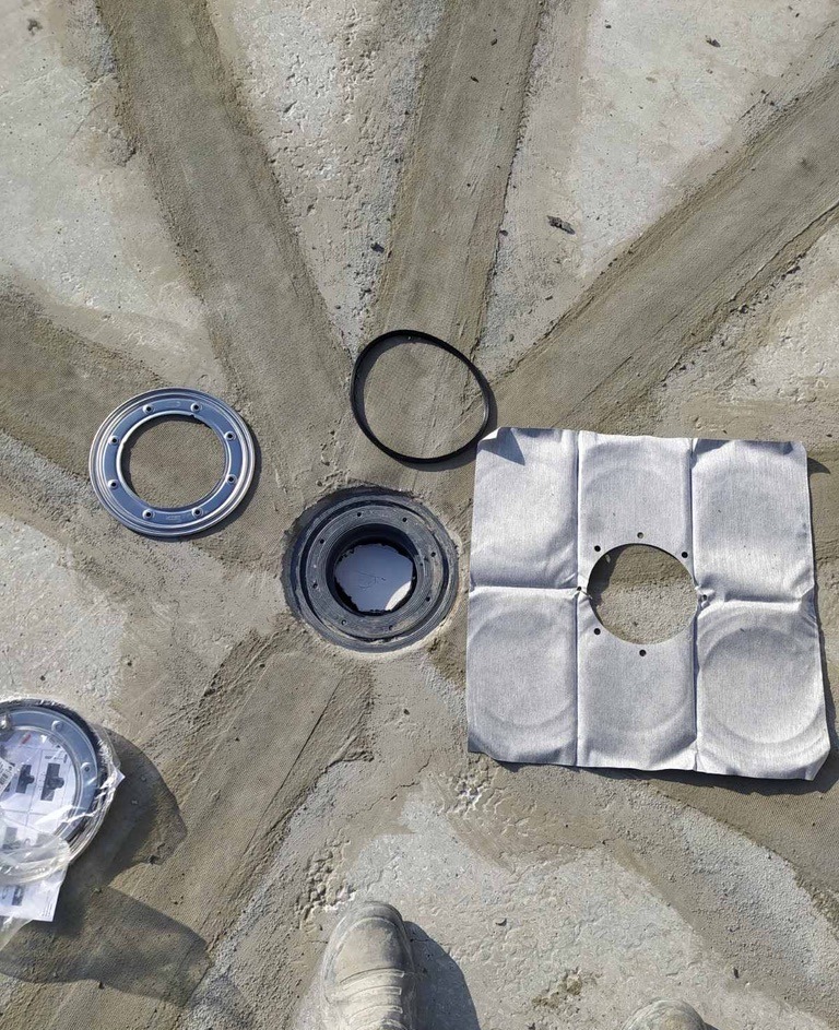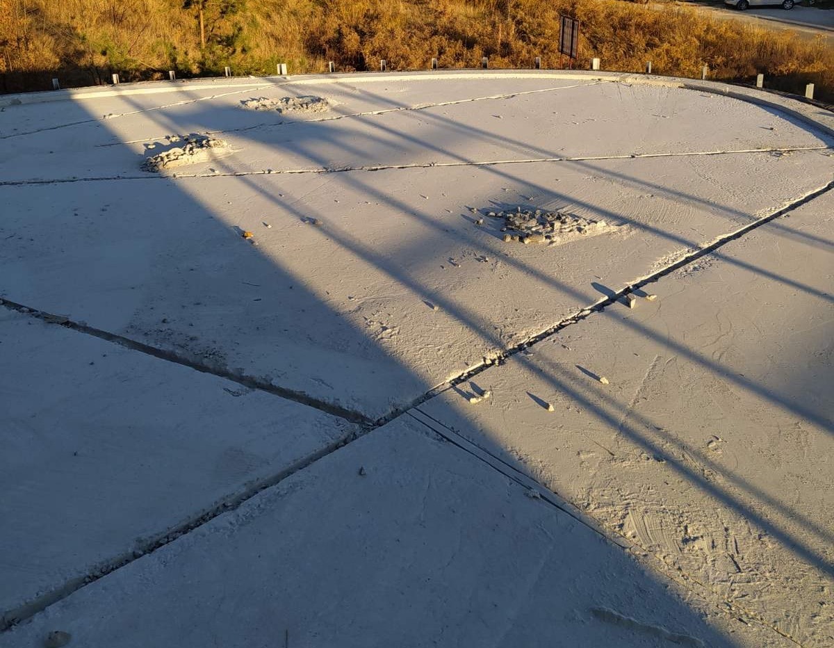 - Подготовка и монтаж систем: Очистка основания и установка сливных воронок и лотков. Герметизация примыканий сливных элементов выполнена по комбинированному принципу: стык уплотнен полиуретановым герметиком, после чего узел жестко зафиксирован ремонтной смесью KRYS RM FAST.