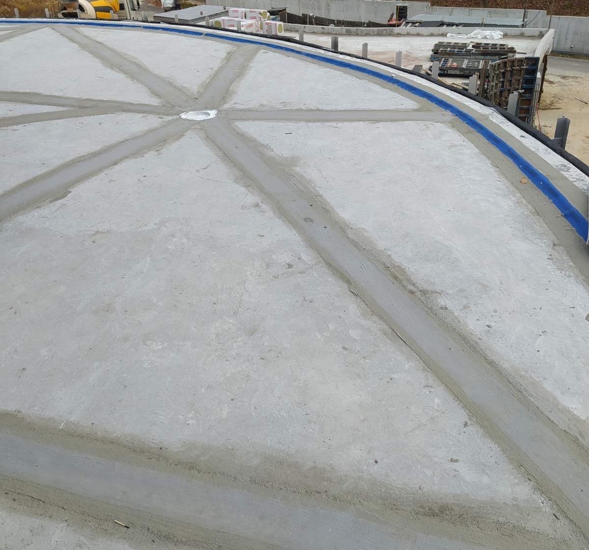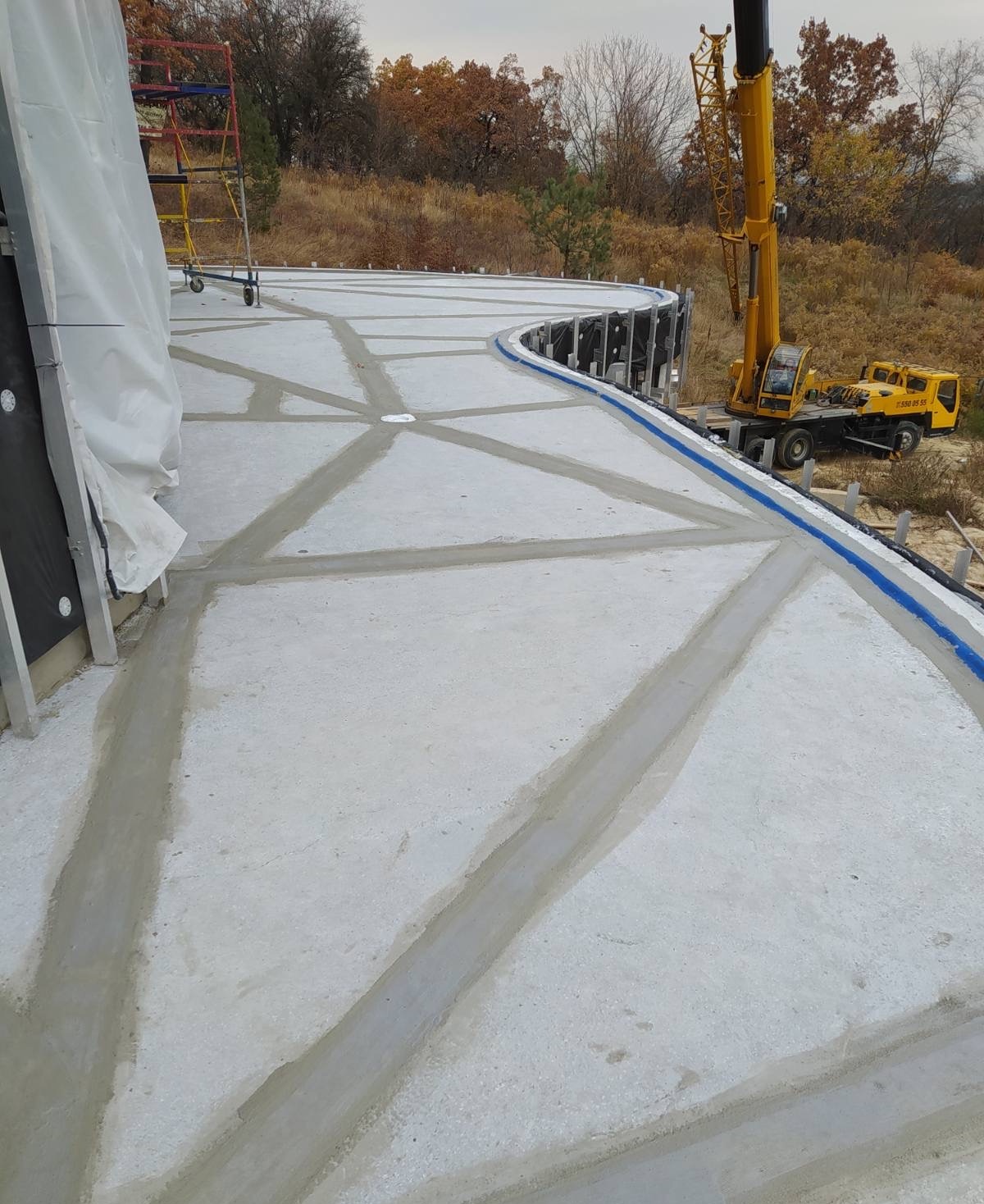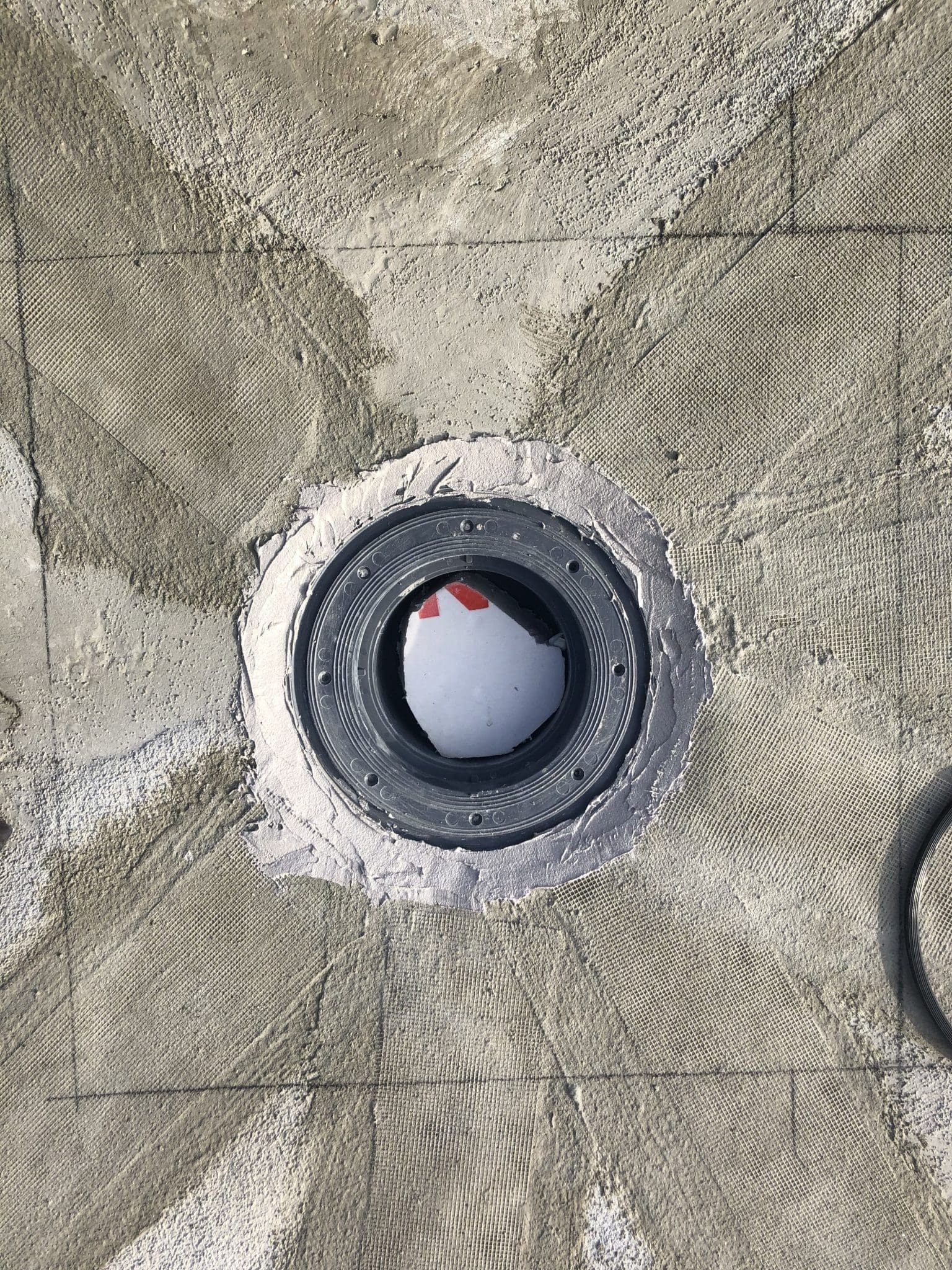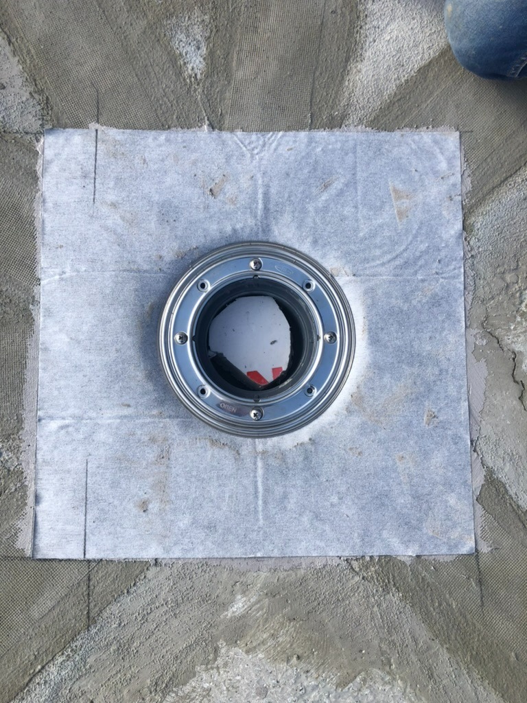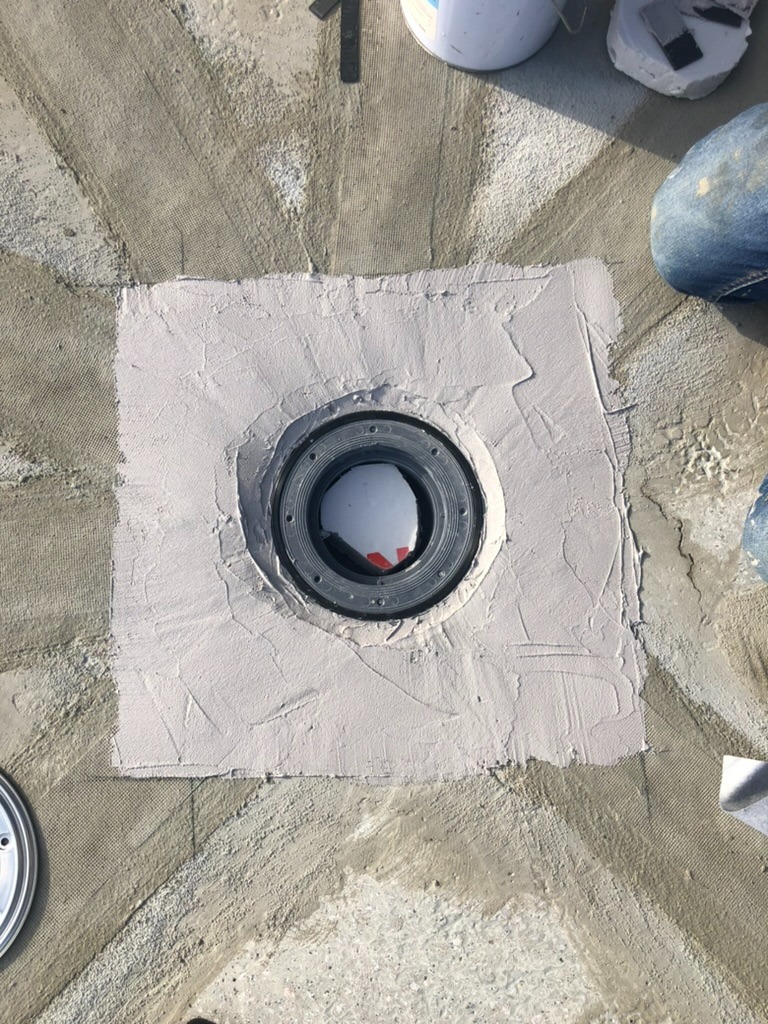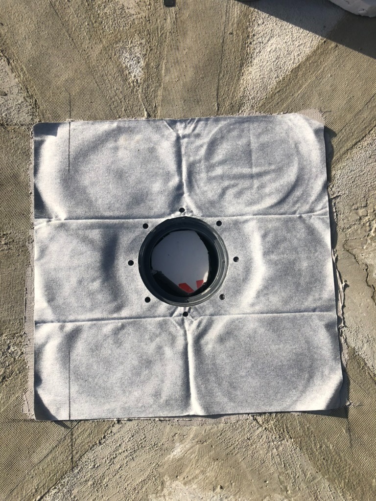 - Армирование: Все примыкания, а также зоны вокруг лотков и воронок дополнительно усилены слоем эластичной гидроизоляции KRYS FLEX с утоплением армирующей стеклосетки.