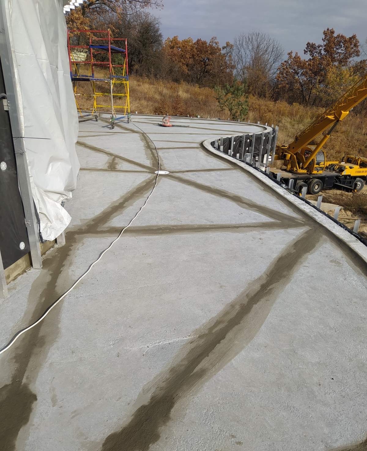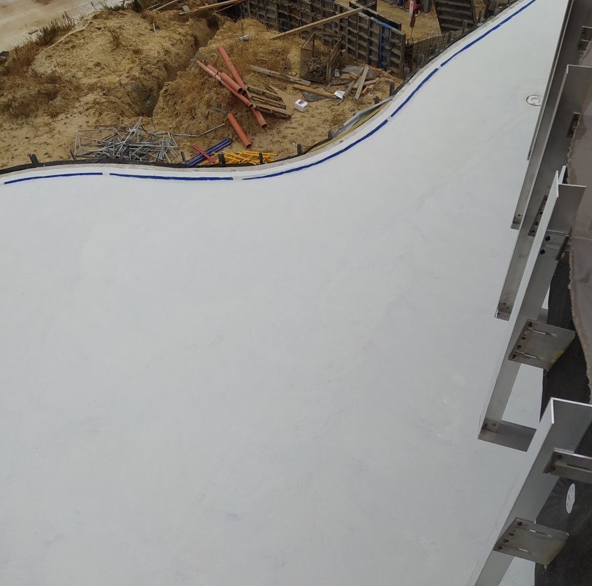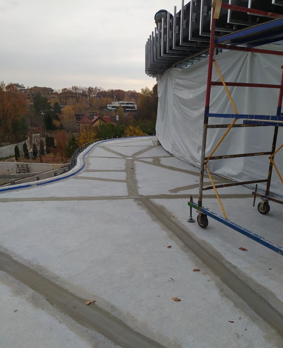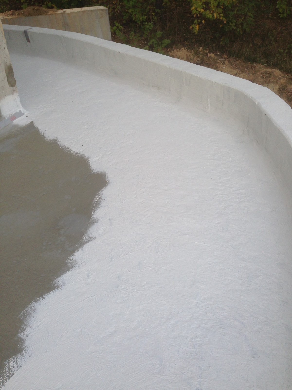 - Армирование: Все примыкания, а также зоны вокруг лотков и воронок дополнительно усилены слоем эластичной гидроизоляции KRYS FLEX с утоплением армирующей стеклосетки.