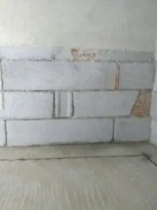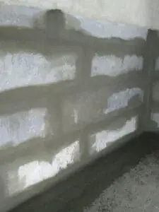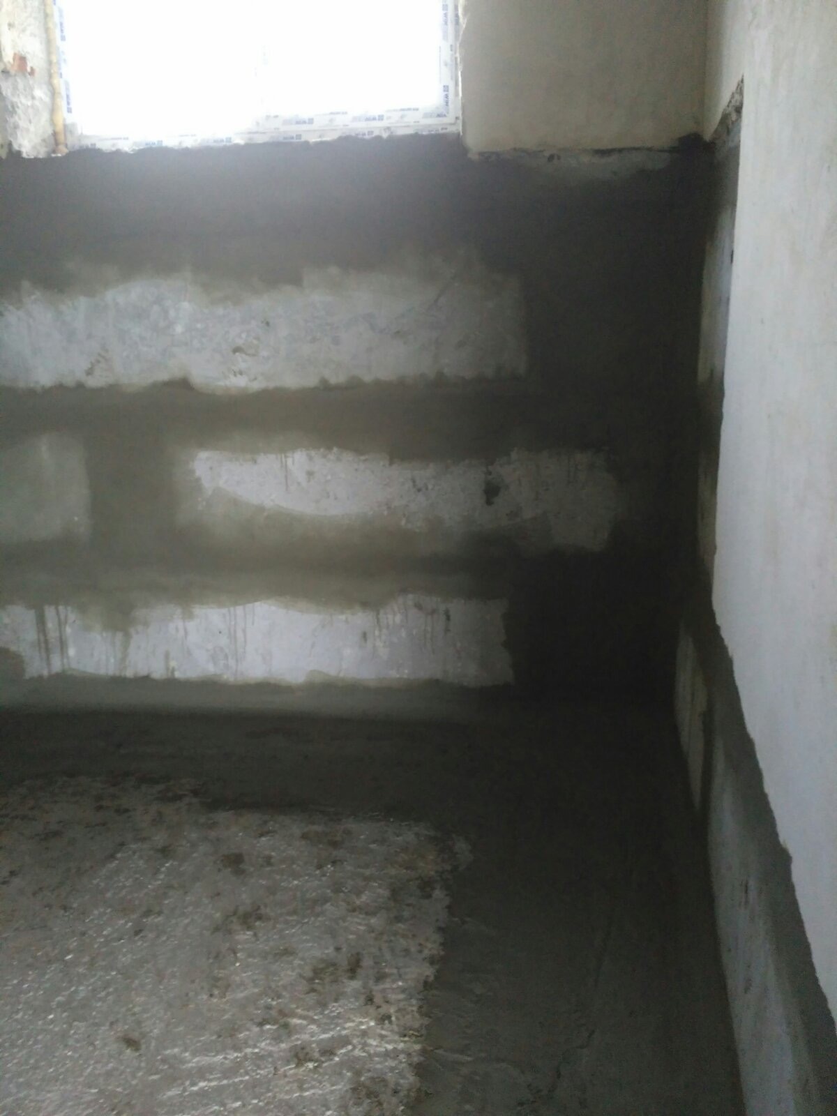 - Подготовка поверхности: Блоки ФБС очищены гидроструйным аппаратом (давление до 300 атм). Выполнена расшивка (выбивание) старого раствора из межблочных швов и разбивка примыканий "стена-пол" для доступа к стыкам.