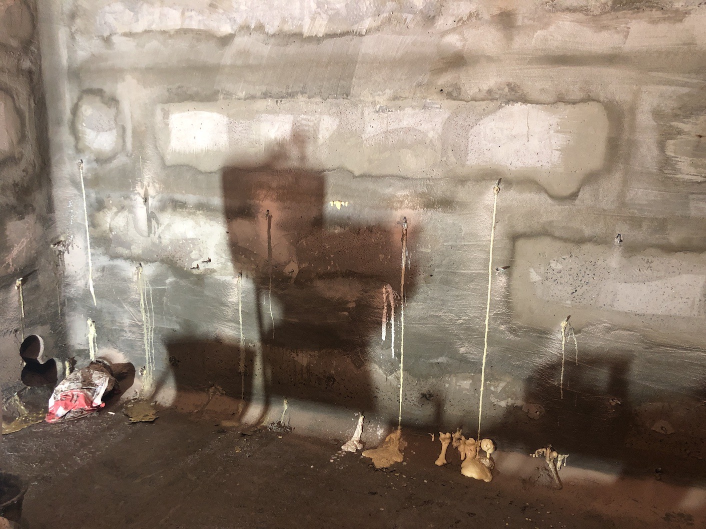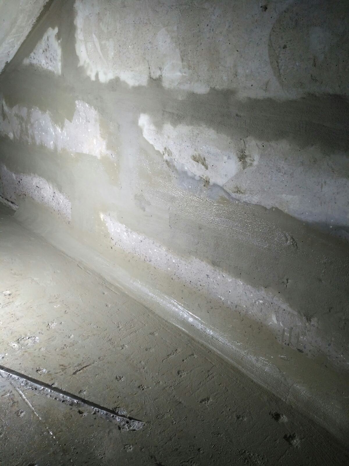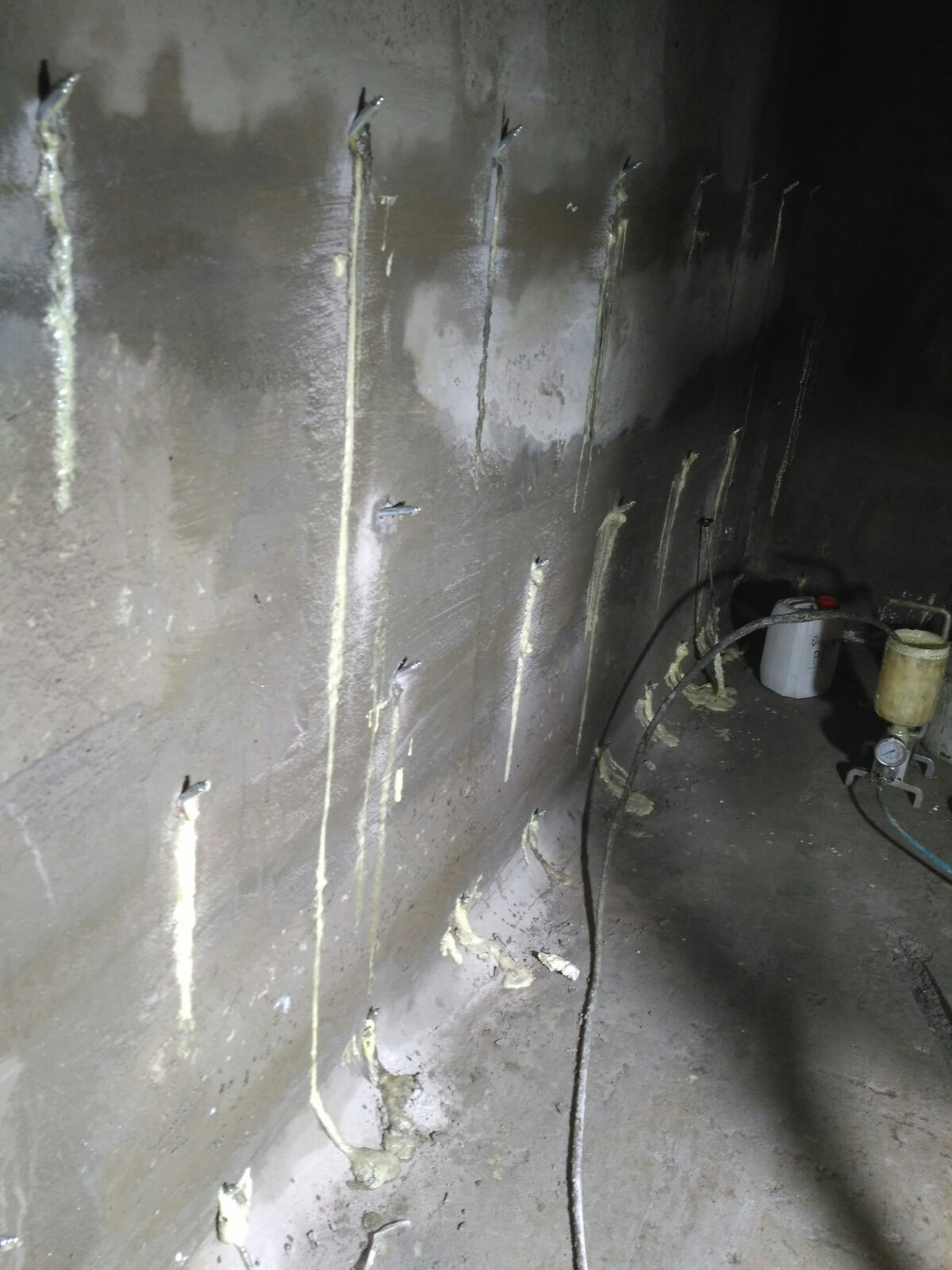 Фундаментные стены из блоков ФБС находились в плохом состоянии с глубокими пустотами в швах. Поскольку на момент проведения работ активных протечек не было (сухой период), появилась возможность применить технологию предварительной герметизации швов перед инъектированием.
