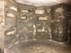 - Глубинное инъектирование: После набора прочности ремонтного слоя проведено бурение шпуров и установка пакеров. Через них под давлением закачана жесткая однокомпонентная пена KRYS INJECT 1C. Поскольку швы уже были закрыты KRYS RM FAST, пена не выходила наружу, а под давлением распространялась внутри стены, заполняя все скрытые пустоты и скрепляя блоки между собой.